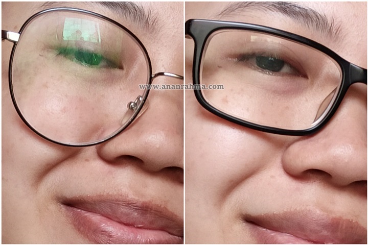 Foto di atas merupakan perbandung kacamata lensa antifog (sebelah kiri) dengan lensa essilor crizal (sebelah kanan). Pada lensa antifog, pantulan atau bayangan bisa terlihat lebih jelas.
